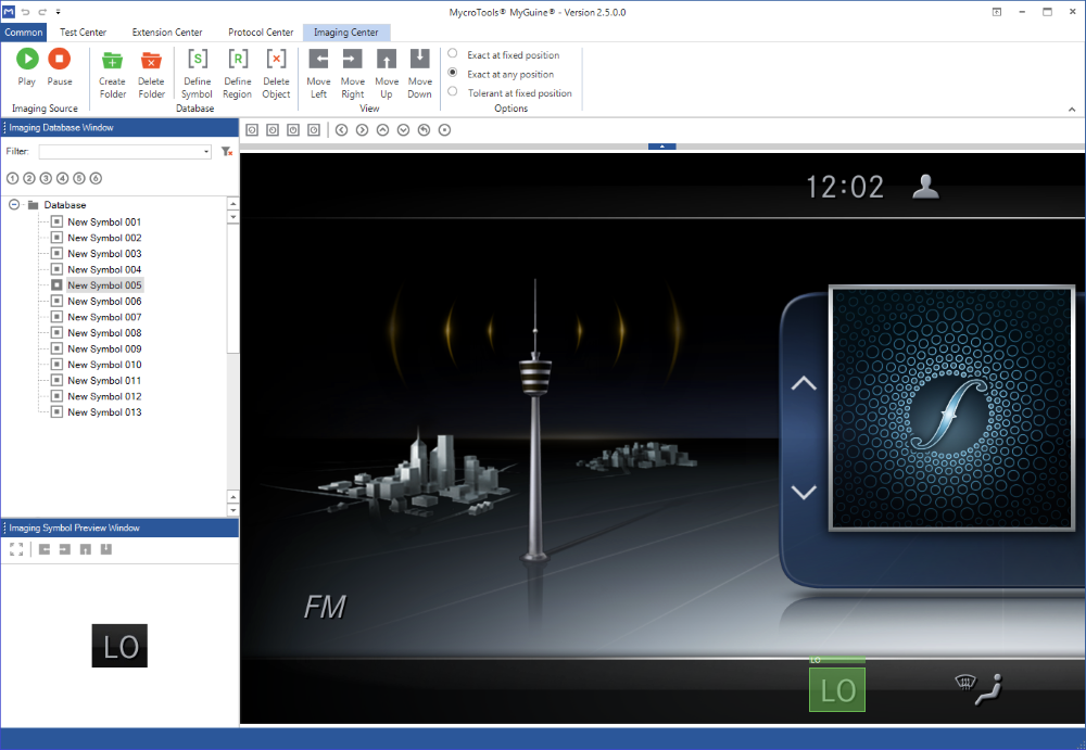Especially for HMI-Tests of Head-Units and Combi-Instruments a powerful Imaging-System was developed by MycroTools® that got integrated in the flexible MycroTools® MyGuine® testing framework. This system extends the software by an Optical Character Recognition (OCR) for a variety of fonts and languages, an advanced symbol recognition (e.g. warning signs, pictogram etc.) as well as an image database for managing all system-taught symbols, which are structured by design and country language. The usage of the imaging system is simple and straightforward.